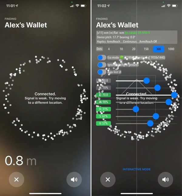 目前已经有不少用户在第一时间购买了AirTag,但是你知道它还有隐藏的开发者模式吗?当你在“查找”App中开启精确查找功能,并点击物品名称4次,即可开启开发者模式。在该模式中,我们可以看到诸如加速计和陀螺仪坐标、触觉反馈、屏幕分辨率、跟踪动画等等信息。