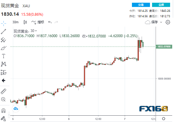 非农报告公布后,现货黄金加速上涨25美元,刷新日高至1843.26美元/盎司关口,较日低高出逾30美元。