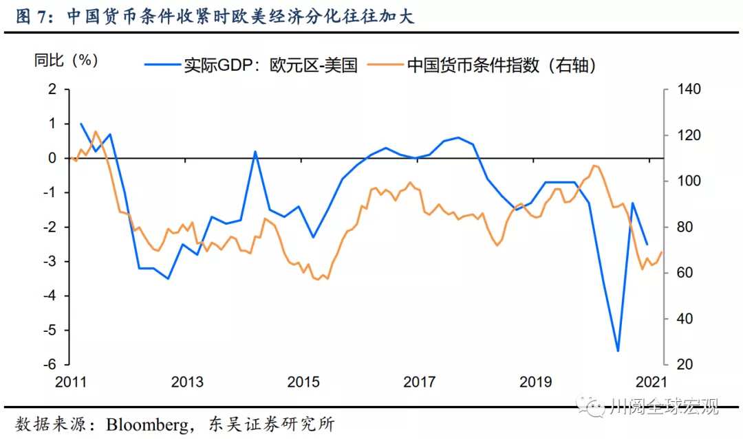 美欧经济分化也受到中国货币条件的影响。历史上当中国的货币条件趋于宽松时,欧元区相对美国在GDP增速上的差距会缩小(图7),这是因为欧元区作为外向型经济体,比美国更受益于中国的货币宽松。但当前中国经济已经走出疫情,因此下半年货币条件难有进一步宽松。