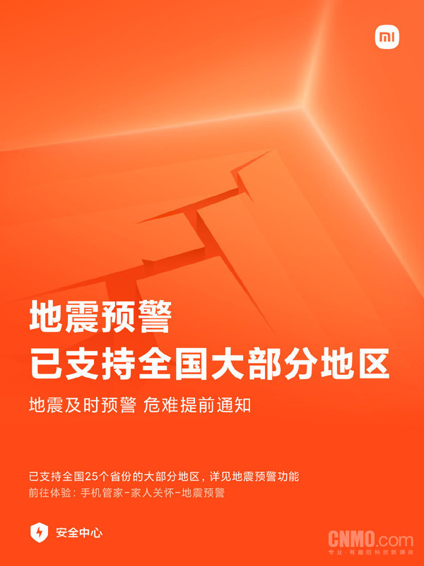 小米:MIUI成功预警4.0级以上地震35次 支持25个省份