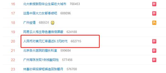 周三下午,#人民币对美元汇率逼近6.3元时代#登上微博热搜,网友表示,利于出去玩,但是去不了。