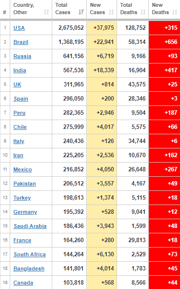 全球确诊病例超过10万例的国家达19个,从多到少排序依次为美国、巴西、俄罗斯、印度、英国、西班牙、秘鲁、智利、意大利、伊朗、墨西哥、巴基斯坦、土耳其、德国、沙特阿拉伯、法国、南非、孟加拉和加拿大。目前,卡塔尔的确诊病例正在接近10万,目前累计报94413例。
