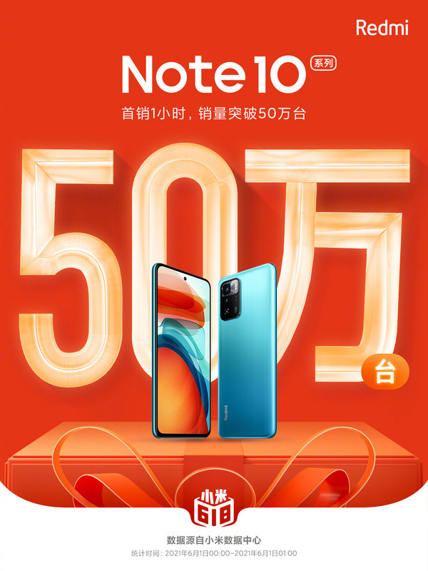 6月1日,618大促首日,999元起的Redmi Note10系列正式开售,首战告捷!据Redmi红米手机官方战报,Note10系列1小时销量突破50万台!