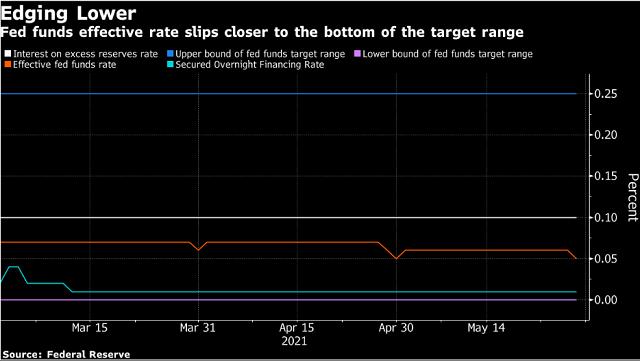 美联储周二表示,联邦基金利率5月28日下降1个基点至0.05%,创下4月末以来最低水平。虽然官员们在上个月的政策会议上没有调整管理利率,但联邦基金利率持续走低令美联储调整超额存款准备金利率以及逆回购利率的可能性升高。