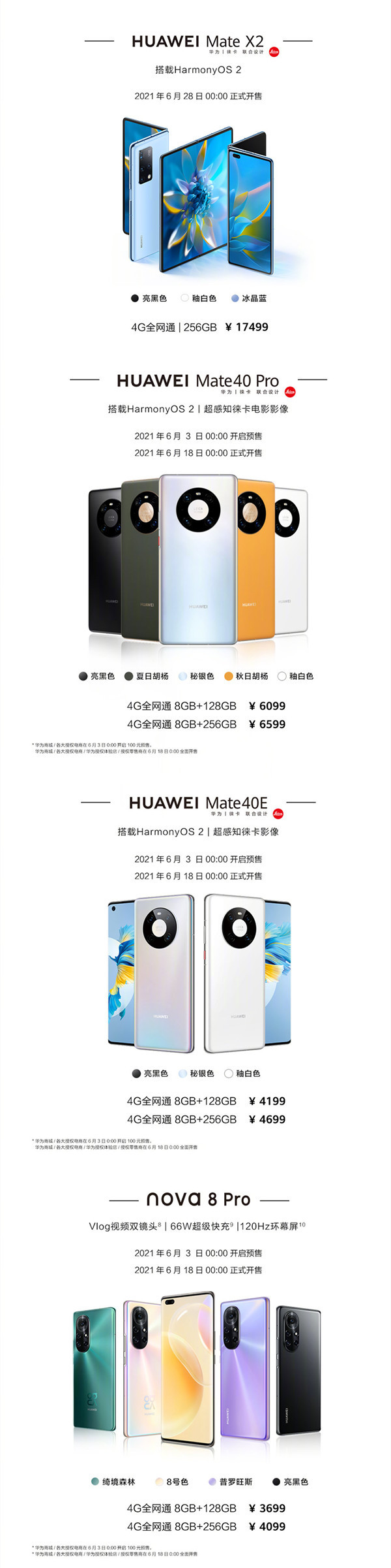 以上3款机型将于6月3日0:00在华为商城/各大授权电商开启100元预售,6月18日0:00在华为商城/各大授权电商/华为授权体验店/授权零售商全面开售。
