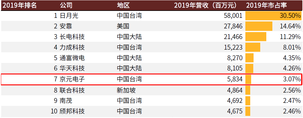 京元电子成立于1987年,主要从事半导体产品封装测试业务,封测营收全球排名第七,其中测试营收全球排名第二。总公司位于中国台湾新竹,生产重镇位于中国台湾苗栗。在中国大陆的子公司有京隆科技和震坤科技,生产工厂设于苏州工业园区,也从事半导体产品封装及测试业务。另外,京元电子在北美、日本、新加坡设有业务据点。