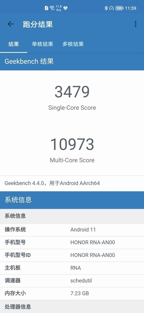 随后我们还使用了GeekBench来测试硬件的性能。在GeekBench 4基准中,荣耀50 Pro获得了单核3479分、多核10973分的成绩,可见6nm芯片在性能方面的表现可圈可点。