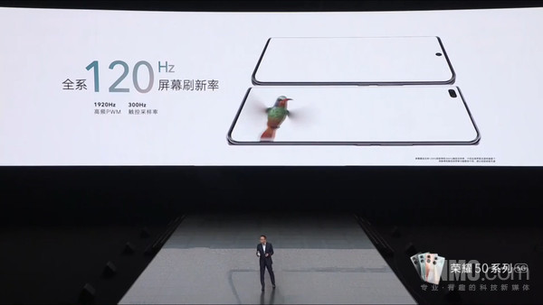 手机正面,荣耀50系列配备了一块75°超级曲面屏,更深的弧面弯曲深度(3.59mm)和更窄的显示黑边(1.31mm),可以为用户带来更高级的视觉观感和柔滑的触摸感。手机支持10.7亿色,对比度达到500W:1,可以带来更好的色彩和明暗表现。此外,两款手机均最高支持120Hz屏幕刷新率和最高300Hz触控采样率。