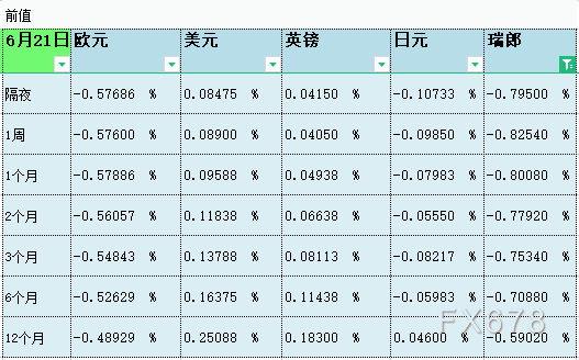 隔夜LIBOR:欧元报-0.58371%,美元报0.08538%,英镑报0.04113%,日元报-0.10450%,瑞郎报-0.80060%;
