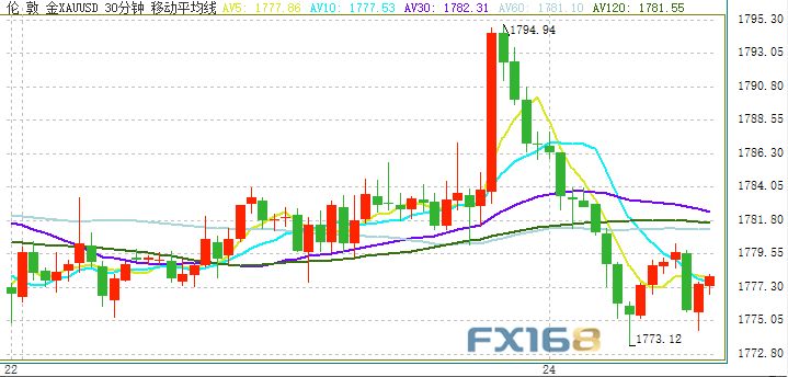 现货黄金自日内高点1794.94美元/盎司大幅回落,最低一度触及1773.12美元/盎司,收报1778.90美元/盎司。
