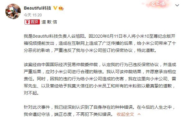 去年8月,数码博主“Beautiful科技”因提前泄露小米10至尊纪念版,违反保密协议,面临百万赔偿。6月24日,此事尘埃落定,该博主在微博上对小米进行了公开道歉,并表示认可该仲裁结果,愿意承担相应的责任。