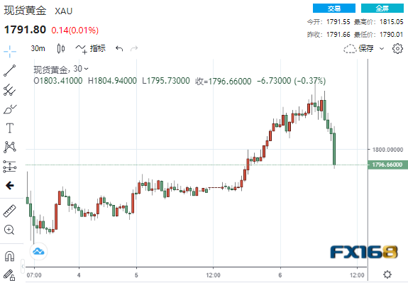 欧美时段盘中,现货黄金一度触及6月17日以来的高点1815.05美元,但随后自高位大幅回落25美元,触及1790美元关口。