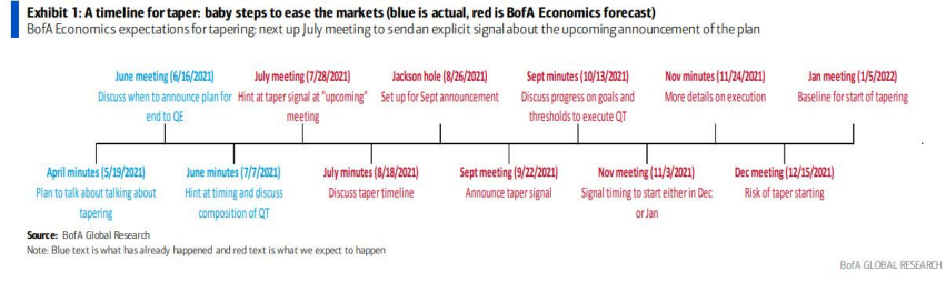 在缩债方面,鲍威尔主席已经非常明确地表示:美联储将慢慢引导市场走向缩减。美国银行在下面的图表中展示了缩减购债规模的时间表,并附上美国银行的预测。