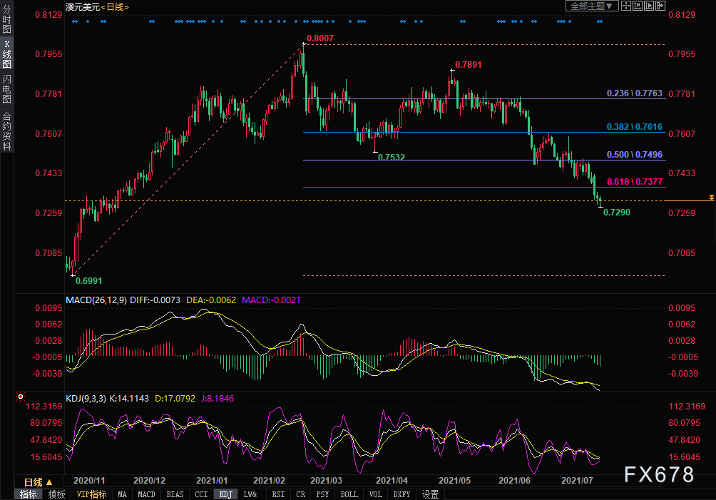 周三(7月21日)澳元兑美元小幅下跌,一度创八个月低位0.7290,因疫情和惨淡的经济数据令澳元承压下行。按目前技术面情况来看,澳元后市仍将继续疲软运行。