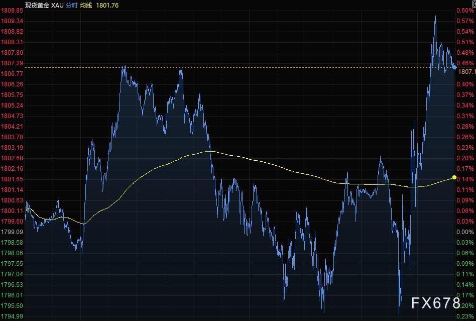 金价周三收复稍早失地上涨,现货黄金收于逾一周来最高水平,报1807.11美元/盎司;此前美联储发表政策声明,鲍威尔指出美国经济仍面临Delta变种病毒带来的风险,美联储离考虑升息还有“很长一段时间”。