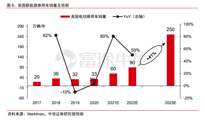 美国新能源车市场触底上升,政策环境趋好。2017年-2020年,美国新能源汽车销量分别为20/36/32/33万辆,随着拜登政府的政策支持,预计美国市场2021年新能源汽车销量有望超过60万辆,同比+80%以上,实现高增长。