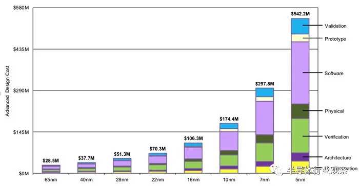 在先进工艺设计成本上,知名半导体技术研究机构Semiengingeering也统计了不同工艺下芯片所需费用,其中28nm节点上开发芯片只要5130万美元投入,16nm节点需要1亿美元,7nm节点需要2.97亿美元,到了5nm节点,开发芯片的费用将达到5.42亿美元,3nm节点的数据还没有,大概是因为3nm现在还在研发阶段,成本不好估算。但从这个趋势来看,3nm芯片研发费用或将接近10亿美元。